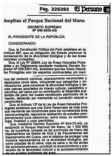 After evaluating the conservation status of the Manu Reserved Zone, INRENA — the government agency in charge of managing Peru’s protected areas — prepared the technical report, “Categorizing the Manu Reserved Zone – Enlarging Manu National Park.” This report served as justification for enlarging the park to 1,716,295.22 ha, and the act was officially proclaimed on July 15th, 2002 through the Supreme Decree N° 045-2002-AG.
