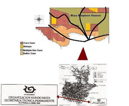 Hasta hace pocas semanas toda la información se basaba en rumores. Una investigación llevada a cabo por ParksWatch Guatemala ha revelado que existe un proyecto oficial que pretendería abrir tres carreteras por la Reserva de la Biosfera Maya, el área de bosque tropical mejor conservada de Guatemala. En junio del 2001 una consultoría para identificar corredores prioritarios para la inversión en turismo en el Mundo Maya (Godoy, 2001), realizada para el Programa de Desarrollo Sostenible del Mundo Maya del Banco Interamericano para el Desarrollo (BID), plantea la construcción de tres carreteras que cruzarían la reserva por dos zonas núcleo: el parque nacional el Mirador – Río Azul y el parque nacional Laguna del Tigre. (ver mapa abajo).